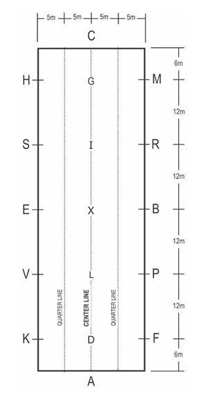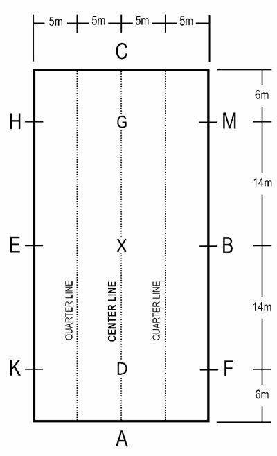 Dressage competition tests act as a check on the progress of the horse as it moves up the levels. Tests are ridden in an arena that is either 20 meters X 40 meters or 20 meters X 60 meters and has letters that mark certain points of the arena. Where the letters originated from is not certain, but an article in the British Dressage magazine (June/July 2000), states that in the old Imperial German court, the walls of the stable yard were initially marked with letters indicating where each courier and/or rider’s horse was to stand awaiting its rider. Eventually, the royal stable yard was used for schooling, training and exercising of the horse, hence the current use of the letters in the dressage arena.